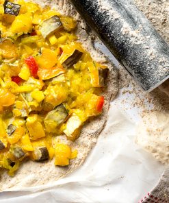 Con masa madre natural de cultivo, trigo autóctono molido en piedra, amasado y estirado a mano. Horneado en horno de leña y piedra. Un relleno aderezado con azafrán natural y aceite de oliva virgen extra.