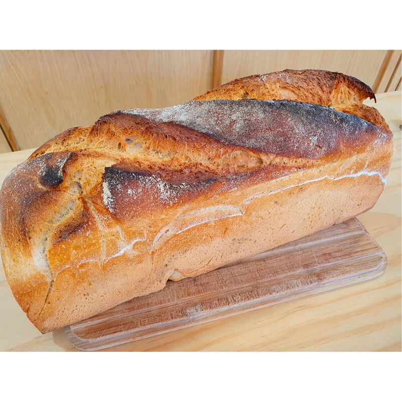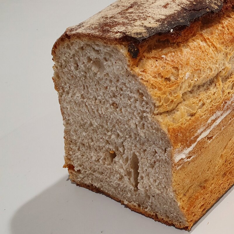 Pan elaborado de forma 100% artesanal, con masa madre de trigo caaveiro integral y de cultivo propio, más de 20%. Proceso natural de fermentación larga. Horneado en horno de leña y piedra.